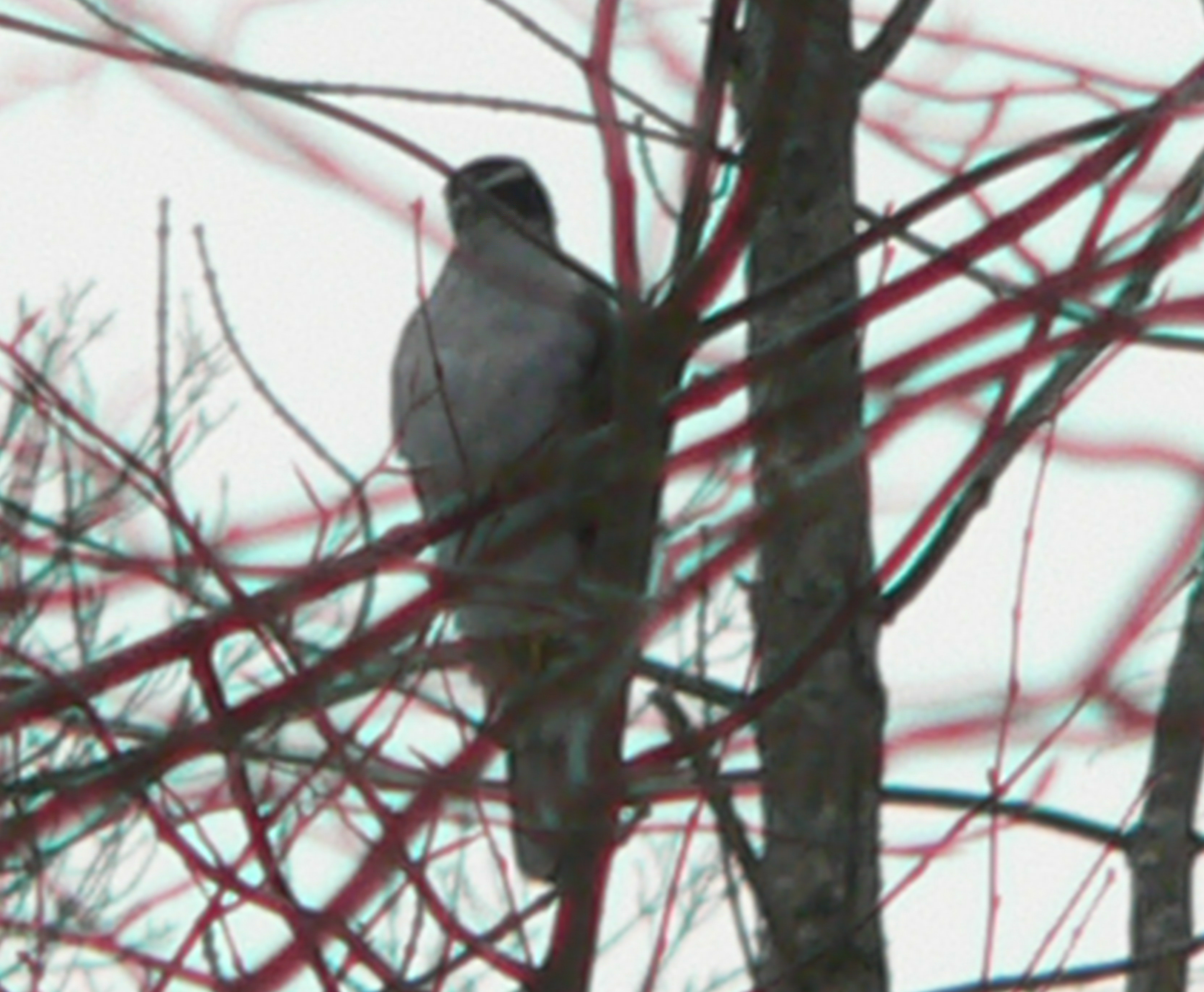 This photo captures a goshawk at long-range using a telephoto lens. This raptor appears to be an adult by its coloring and is quite large at 26 inches long with a wingspan of 50 inches. This hawk has been raiding the bird feeders on our back porch that we put out to attract finches and chickadees. It hasn’t been coming for the seed, but for the small birds and squirrels that frequent the feeder.