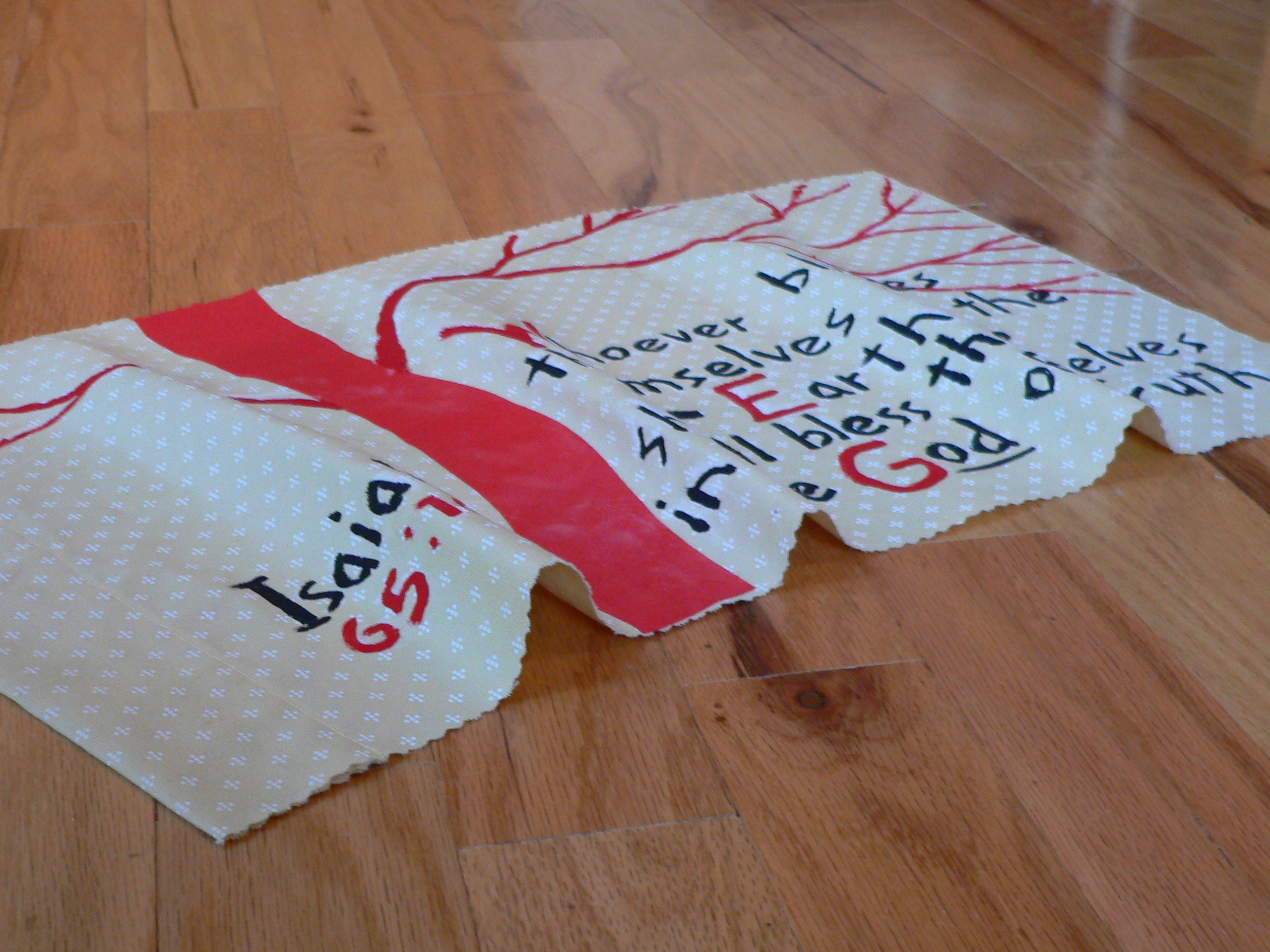 My niece asked me to make a prayer flag for her church congregation in Kentucky. A curious mixture of Buddhism and Christianity, I was intrigued and created the flag in the photo.