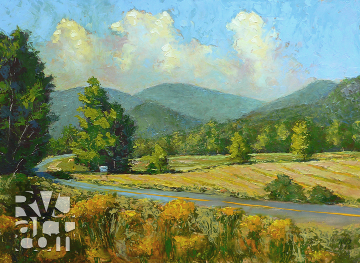 This is Vermont Route 30 heading west into Townshend. A late summer afternoon with goldenrod blooming along the road and hay being cut in the meadows. This painting is one of a series of paintings that I did en plein air during the summer of 2012. I called this series idylls. An idyll is a short description in verse or prose of a picturesque scene or incident, especially in rustic life. Later it became used more expansively as an extremely happy, peaceful, or picturesque period or situation, typically an idealized or unsustainable one. These scenes are idyllic in the pastoral sense but not idealized. This is the working landscape here.