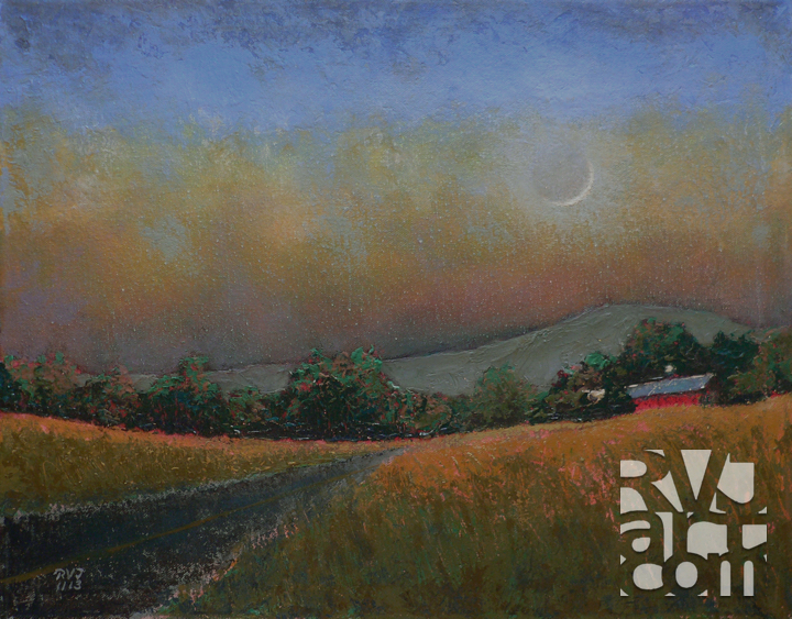 In this painting I am experimenting with low light levels at late twilight. The fading color at twilight is a function of our eyes not seeing the light rays reflecting off of the objects. The color is there, we just can’t see it. I am exaggerating the hue saturation to create a dream-like quality. The moon provides a cool light, hence the slightly cooler palette than I normally use. This series of works are heavily textured with layers of paint and tool marks evident on the surface. Hung in a low light situation they glow with luminosity.